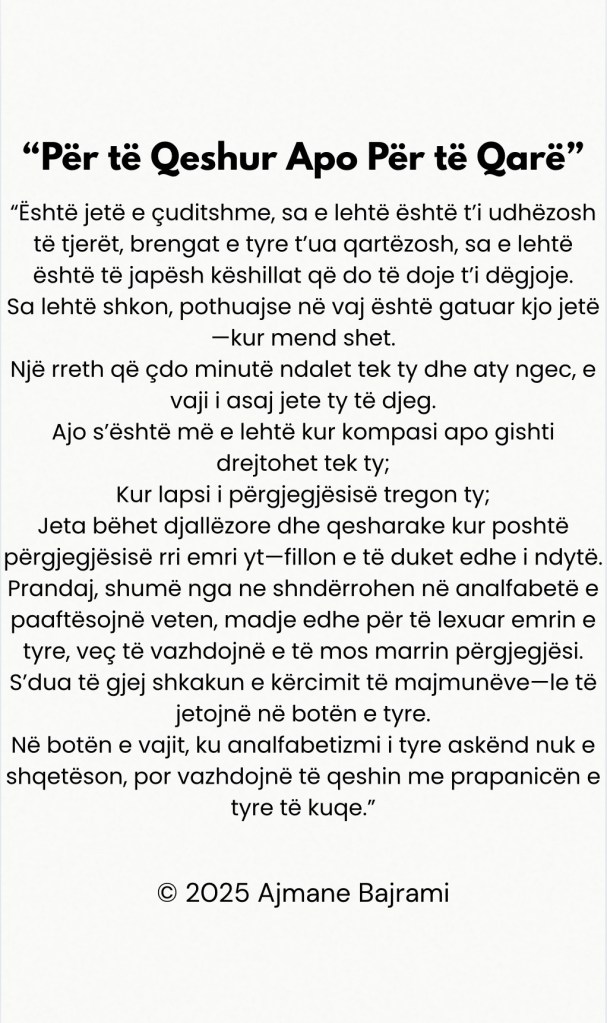 Prandaj, shumë nga ne shndërrohen në analfabetë e paaftësojnë veten, madje edhe për të lexuar emrin e tyre, veç të vazhdojnë e të mos marrin përgjegjësi.